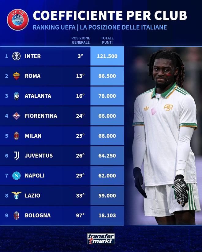 北京时间11月30日,德转列出了意甲俱乐部近5个赛季的欧战积分排名,此前三个赛季两进欧冠决赛的国际米兰断崖式领先,罗马位居第2,AC米兰和尤文图斯仅排名第5和第6位。
